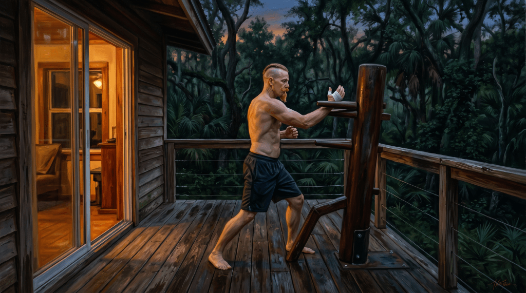 The dummy has three arms and a leg. The arms are positioned to represent an opponent — not a specific opponent, not a style, not a system. They represent *opposition itself.* The geometry of a thing that is in your way. The dummy doesn’t attack you. It doesn’t yield to you. It doesn’t care how you feel about it. It just stands there, in the exact configuration that exposes every flaw in your structure, and waits.